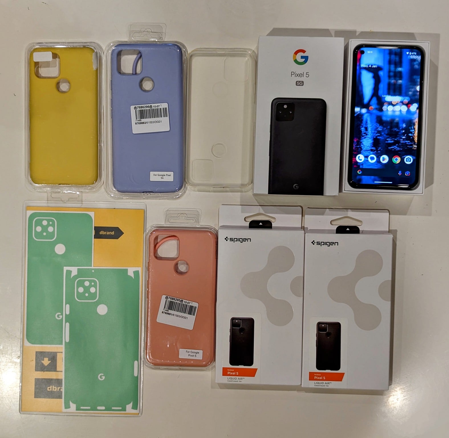 Comes with original box(but no charger and usb-c cable included). Also included are a selection of cases and 2 new skins from dBrand. the phone has always been kept in a case, with a skin and tempered glass screen protector. The Phone was purchased from Dick Smith 2 years ago and still works great - I've just upgraded to Pixel 7 Pro, so it is no longer needed.