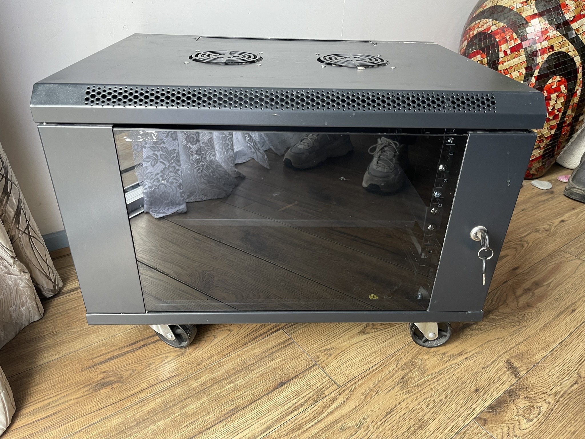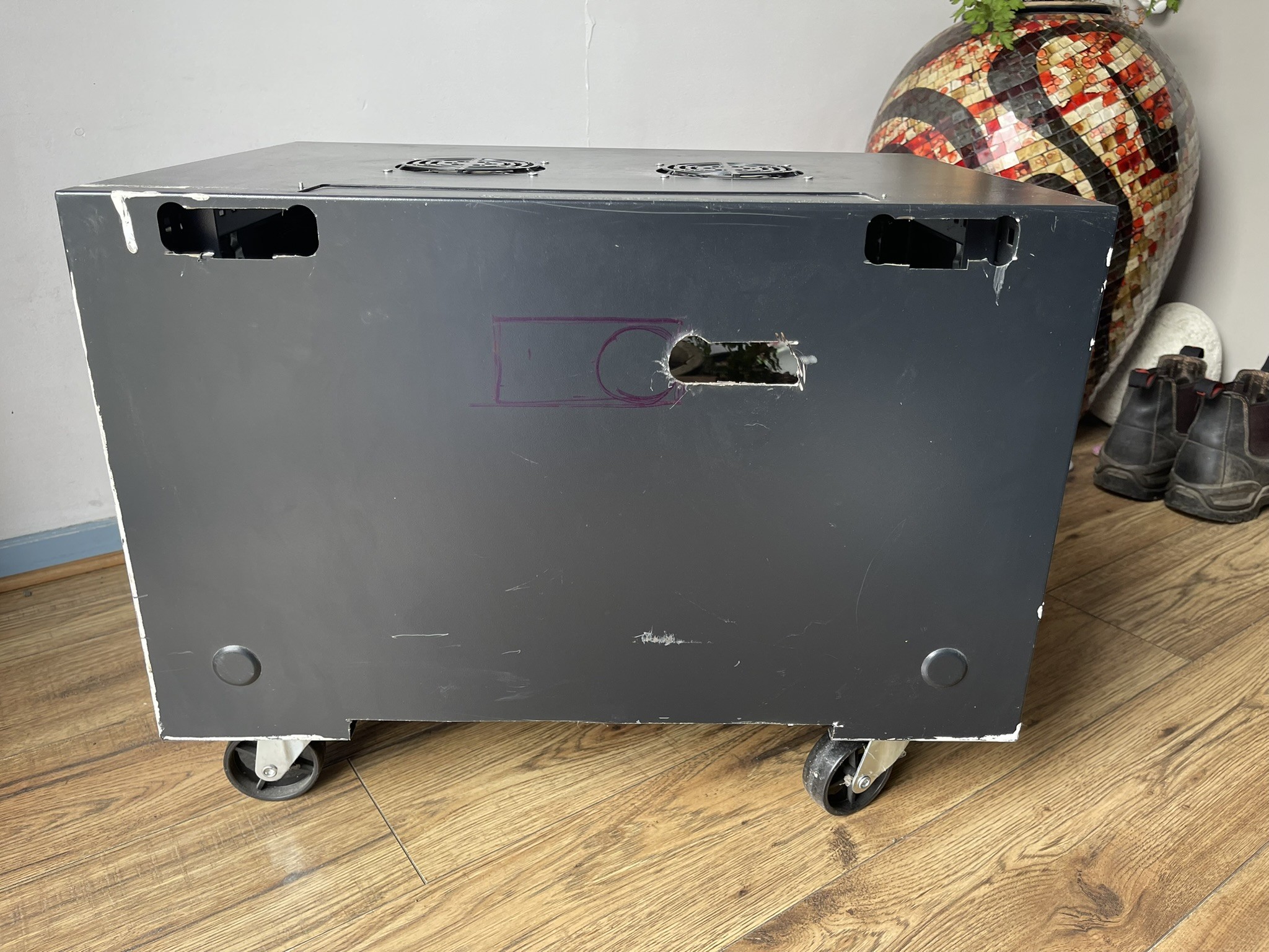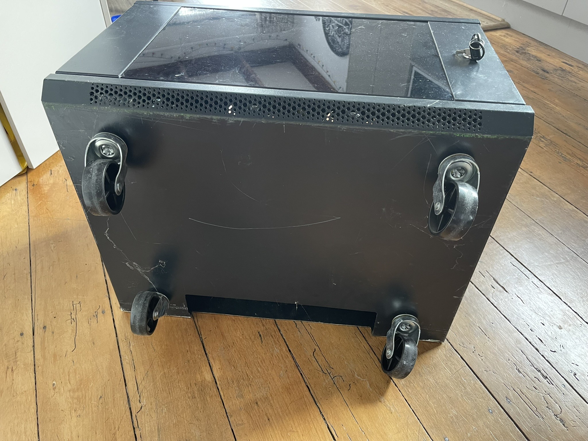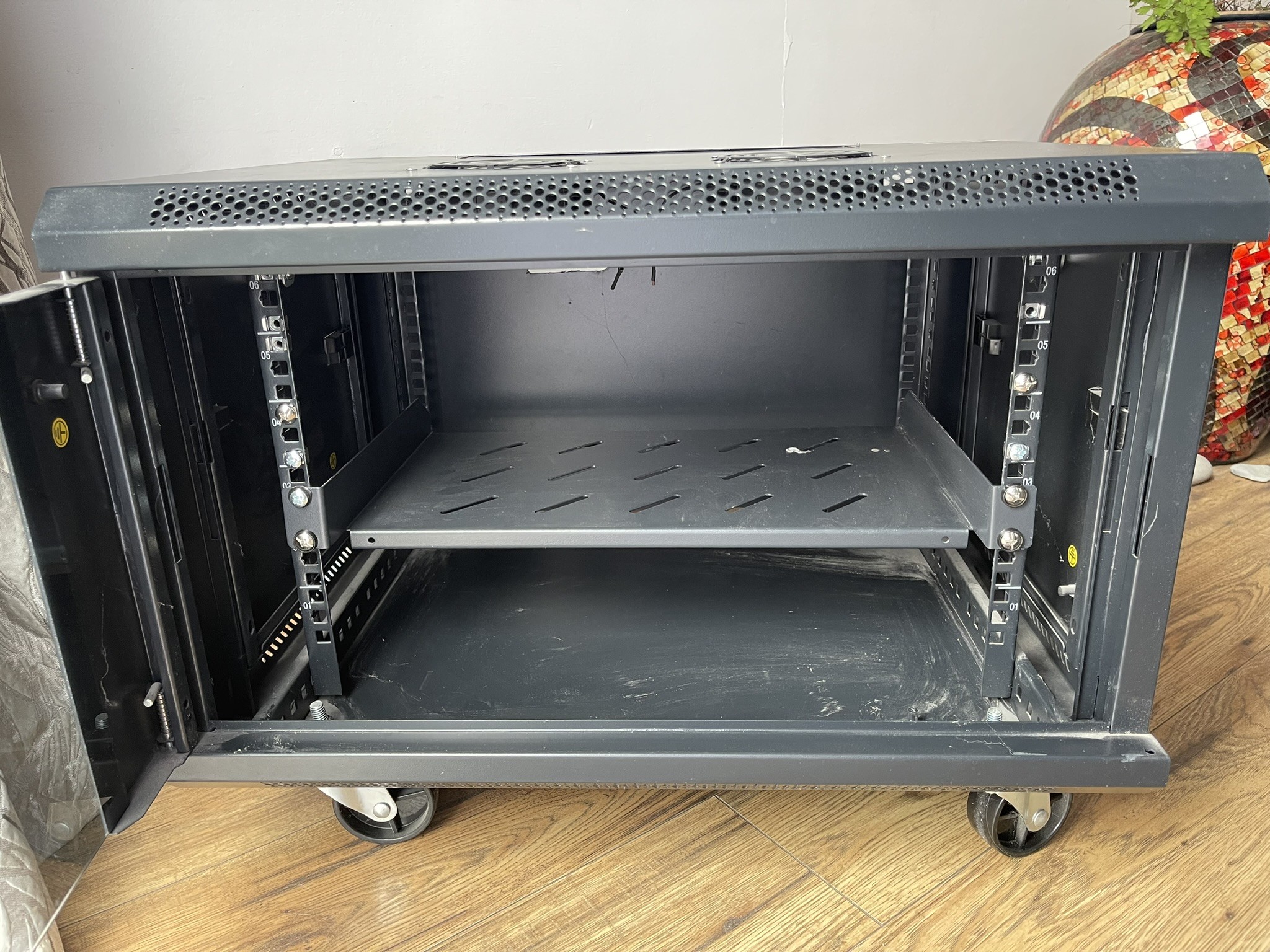 Dynamix 6RU network cabinet on castors. Comes with a shelf. Cable holes have been cut in the back as pictured. Dusty and needs a clean :)