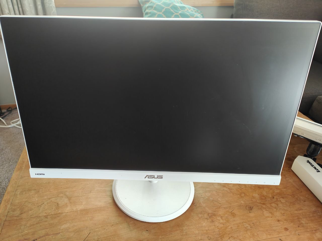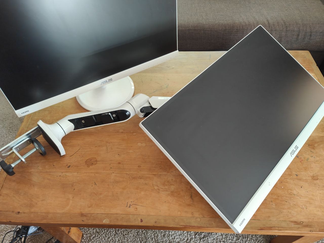 2x white Asus 23" Full HD monitors - exactly these ones: https://www.asus.com/displays-desktops/monitors/eye-care/vc239h-w/ bought in April 2020.