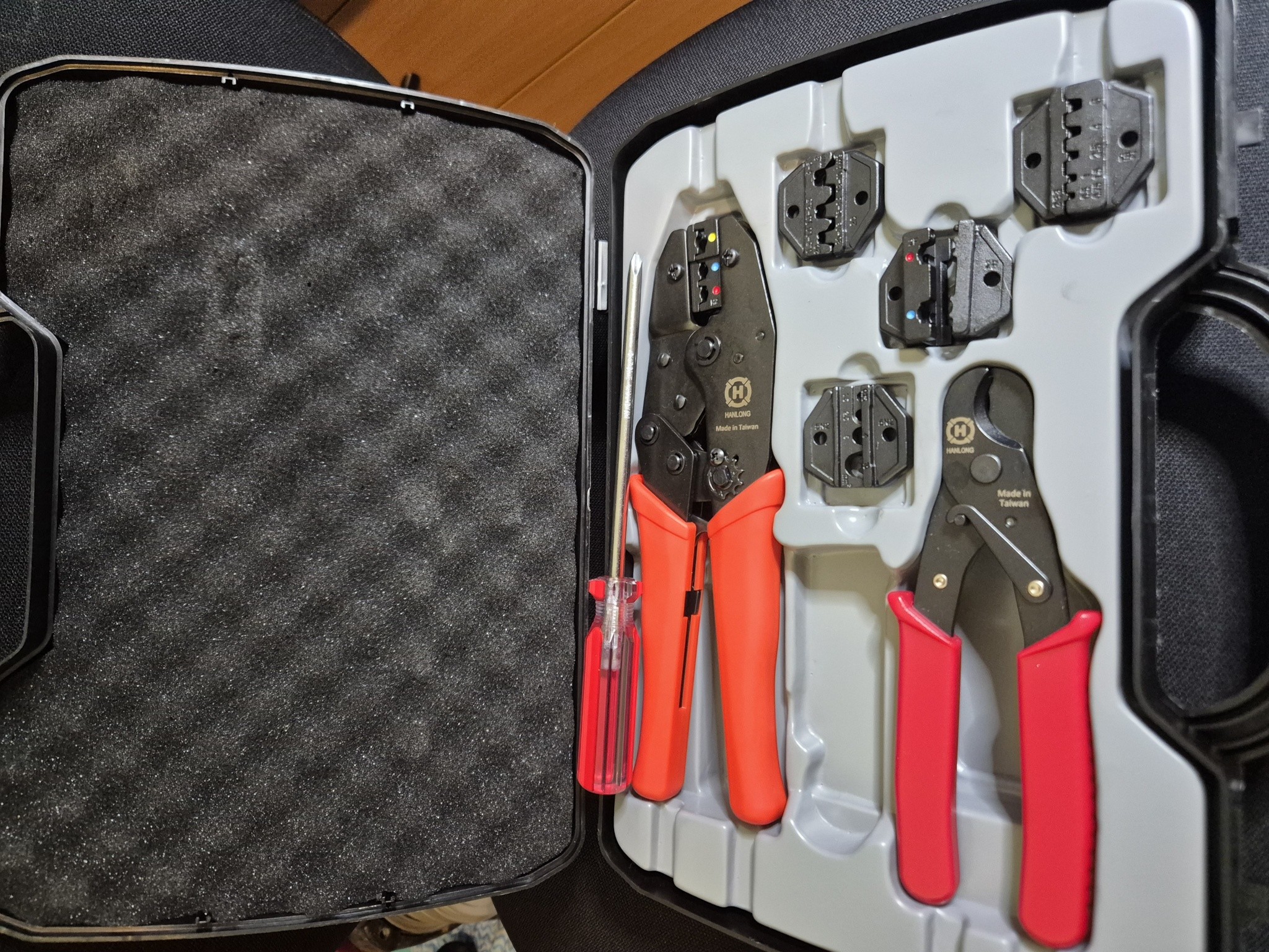 This was originally an RF crimp tool and die set which I bought to get the RF connector dies. These have been swapped out for an unused set of electrical dies.