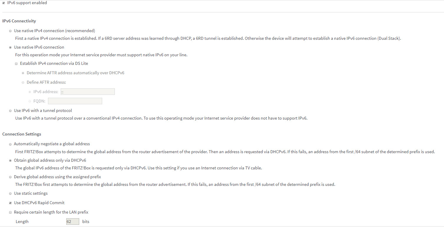 dauckland: Not familiar with your hardware but trying to map your setting onto my router I’d say you need to select first option for global address. I think all assignments happen over ipv4 first.