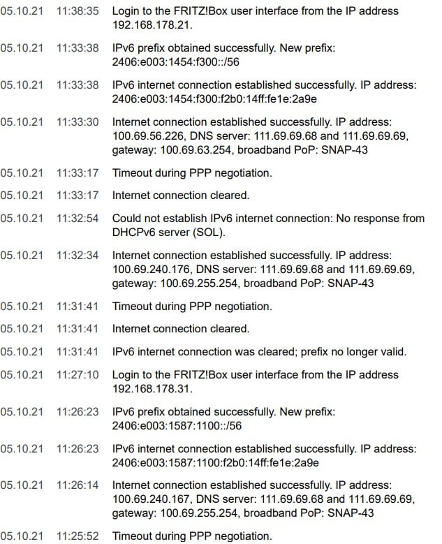 - Intermittent disconnects. My net would drop between 6am to 10am and 6pm to 10pm a couple of times a day for 2min. Event log in the Fritzbox shows PPP timeout and a reset of the IVP6 address. This occurs frequently.