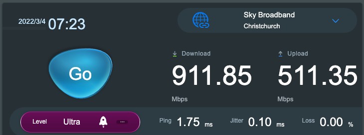 Feeling pretty lost while investigating my Fibre speed, haven't had much response from Slingshot. I was wondering if anyone has experienced similar issues and whether they were resolved. Below is the speed I reach on my laptop, connected over ethernet. This speed is consistent with the speed test done both through the Slingshot provided router and through an ASUS in-router speed test. I am on the Unlimited Gigantic plan (~950/450). I have spoken on the phone to Slingshot a couple of times, they had me run a linetest, which I was able to do, then they had me run another linetest on a separate device. The results were again consistent.