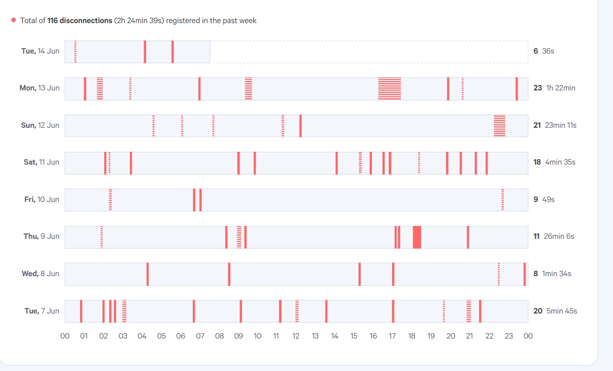 This looks like a screen-grab from a SamKnows Dashboard. If so, be aware that Samknows have acknowledged to me that the whitebox monitoring of connection status - as shown here - is known to be unreliable. My dashboard reported huge levels of disconnections (in the range of 100-500 per day) when I changed RSPs, for about a week. No service interruptions where apparent - we noticed no problems with internet usage during this time so I contacted Samknows prior to raising this issue with my new RSP. They reported back to me that the reliability of disconnect reporting is being evaluated. A few days later reported disconnects dropped to less than 15 per day.