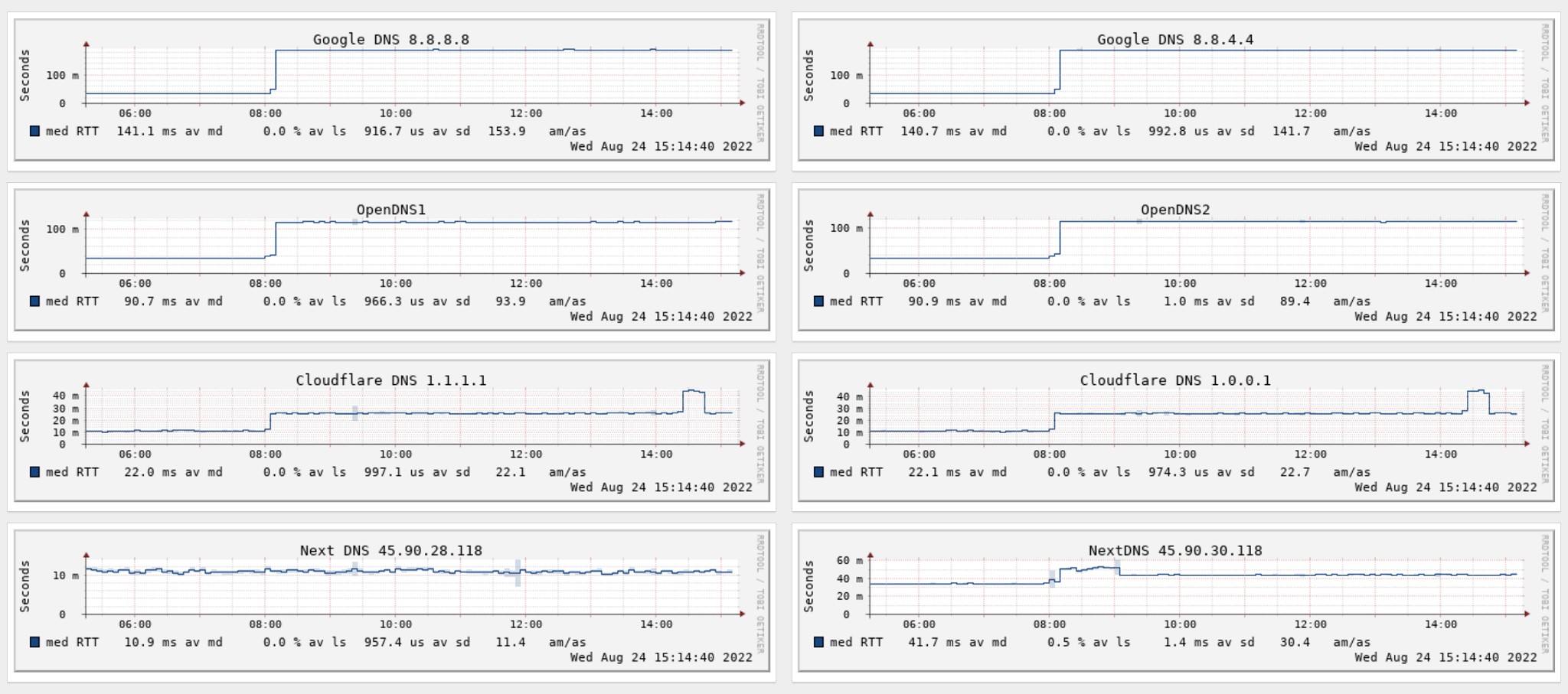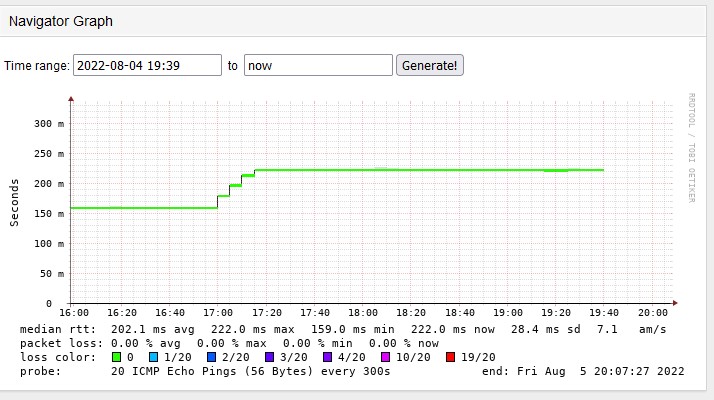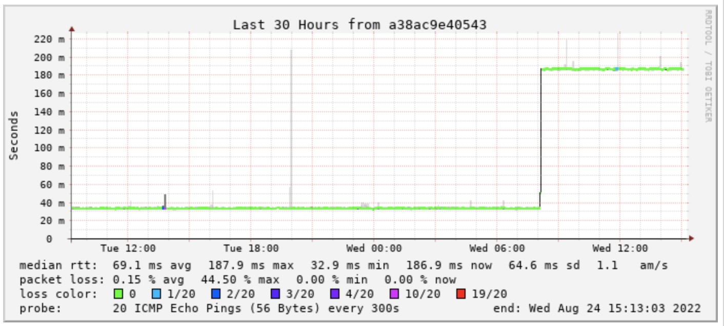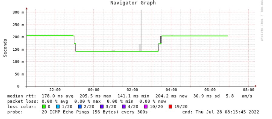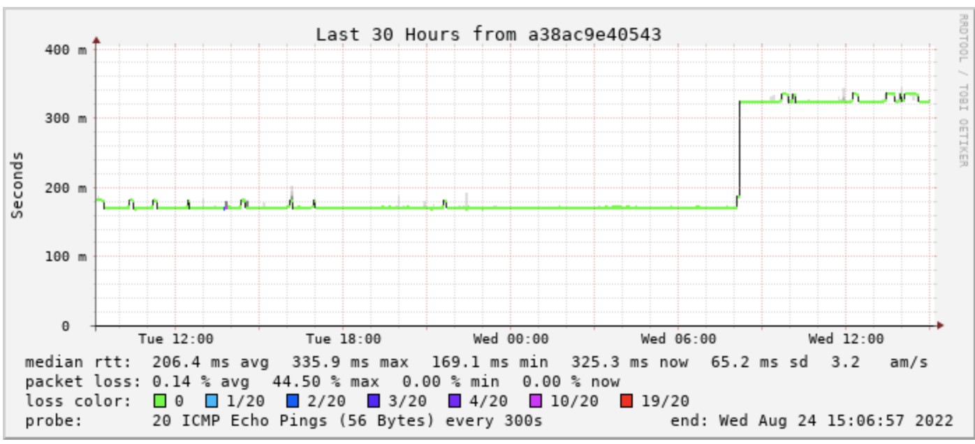 There was a glimmer of hope overnight with RTT returning to previous levels. However it reverted back to over 200ms at about 3:30am