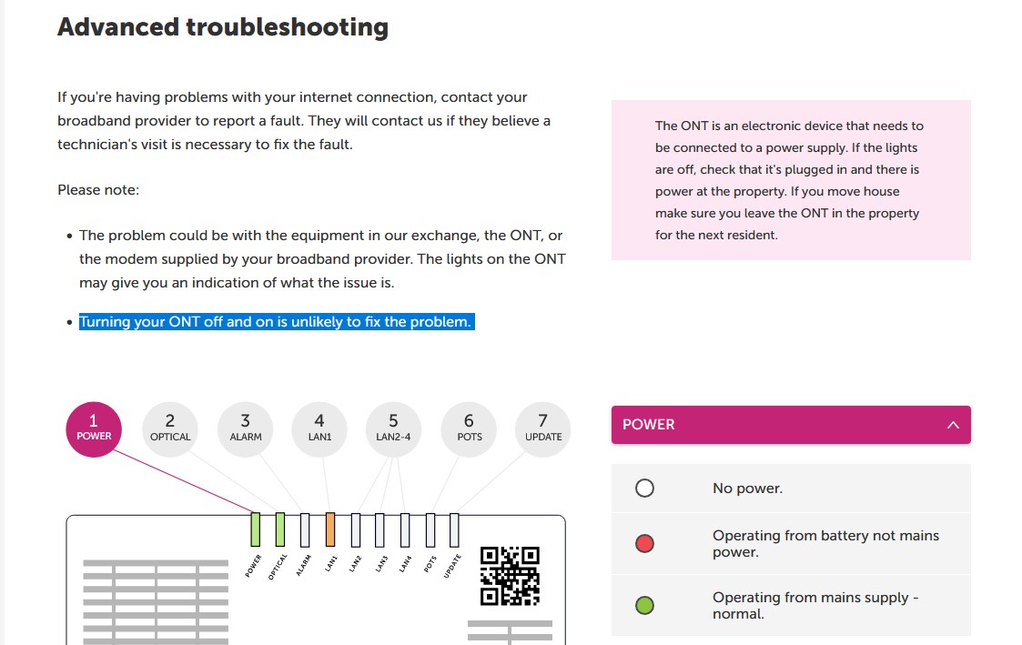 While the internet connection is disabled, power, optical and lan lights on the ONT are on, so that looks good.