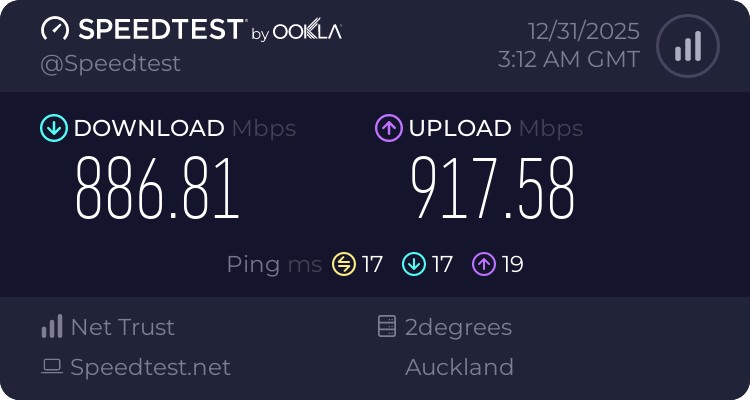 I am out of ideas here. 2Degrees support has been entirely useless, I just get a bunch of Tier-1 helpdesk support people (who I am really respectful and kind to) telling me to restart my devices, to try on ethernet, and that my device might be a bit old and so is getting slow Wifi (iPhone 17 Pro, TP-Link Omada EAP772 connected to router via gigabit POE switch). Whenever I tell them that I have done all that, they just mark the job as resolved and send me some boilerplate email about "If you do not have an ethernet cable, we can send one to you" etc.