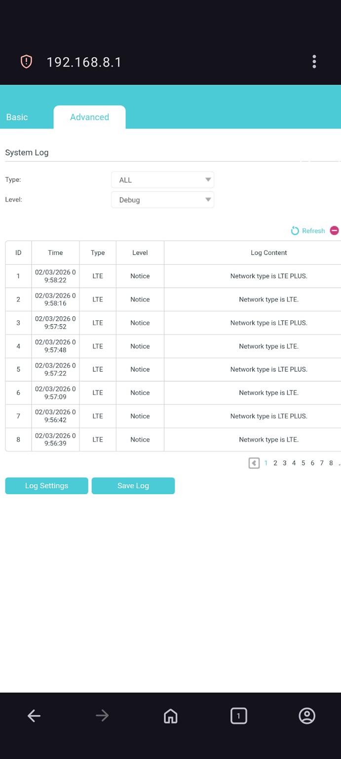 2. The modem system log shows the network type switching between LTE and LTE Plus every few seconds and has done so since the beginning. The modem status tab, however, constantly shows LTE Plus with bands B1,B3,B28,B8. Signal strength 100%, RSRP -88, RSRQ -7, SNR 19.