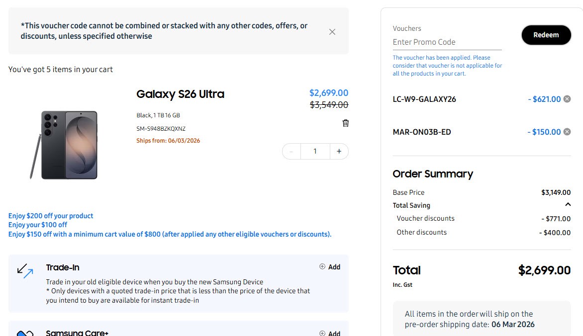 I notice if I add a S26 ultra to my cart again, it says it will ship it out from today.... Not only that, the code that people used to get free 65Watt charger, the charger went out of stock so you didn't get that freebie, no biggie, but again, now if you go to add a new phone to your car, the charger is back in stock and you get that freebie.