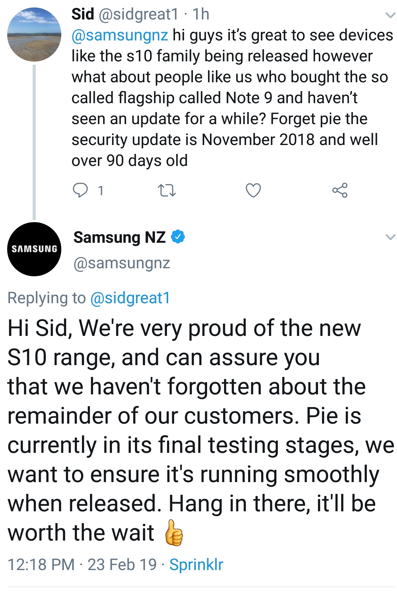 The point is SECURITY, not a new UI. As y.ggdrasil pointed out - there are exploits in the wild that have been patched in updates we have't got. Samsung NZ has not released Dec, Jan, or Feb security patches for Note 9 in spite of the fact that said security patches are available and have been released to Note 9s in many other parts of the world, both for those still on Oreo and Pie. The only way Note 9 in NZ can move off November the 1st security patch is by getting Pie.